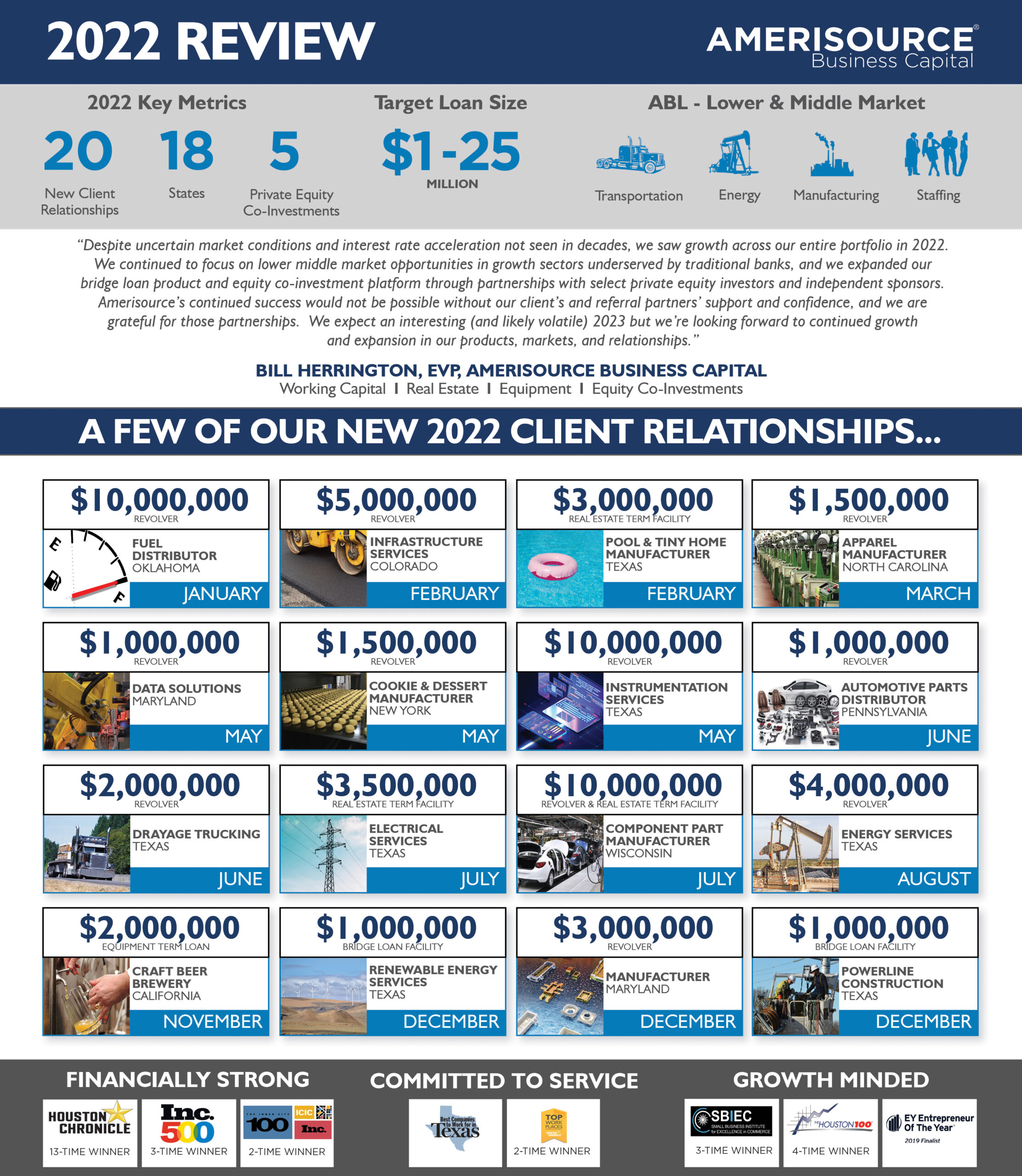 “Despite uncertain market conditions and interest rate acceleration not seen in decades, we saw growth across our entire portfolio in 2022. We continued to focus on lower middle market opportunities in growth sectors underserved by traditional banks, and we expanded our bridge loan product and equity co-investment platform through partnerships with select private equity investors and independent sponsors. Amerisource’s continued success would not be possible without our client’s and referral partners’ support and confidence, and we are grateful for those partnerships. We expect another interesting (and likely volatile) 2023 but we’re looking forward to continued growth and expansion in our products, markets, and relationships.”