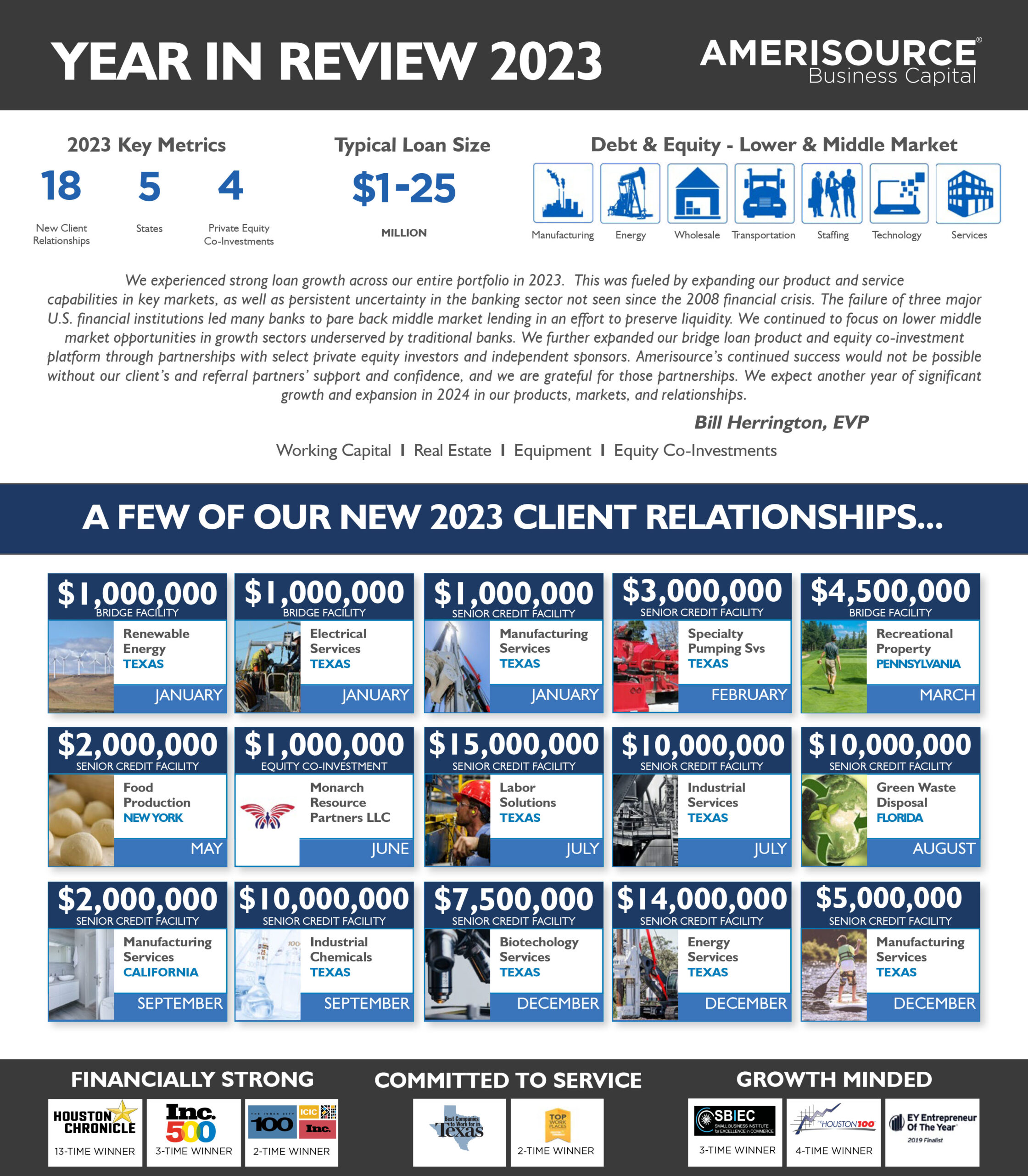 We experienced strong loan growth across our entire portfolio in 2023. This was fueled by expanding our product and service capabilities in key markets, combined with persistent uncertainty in the banking sector not seen since the 2008 financial crisis. The failure of three major U.S. financial institutions led many banks to pare back middle-market lending to preserve liquidity. We continued to focus on lower middle market opportunities in growth sectors underserved by traditional banks. We further expanded our bridge loan product and equity co-investment platform through partnerships with select private equity investors and independent sponsors. Amerisource’s continued success would not be possible without our client’s and referral partners’ support and confidence, and we are grateful for those partnerships. We expect another year of significant growth and expansion in 2024 in our products, markets, and relationships. Bill Herrington, EVP.
